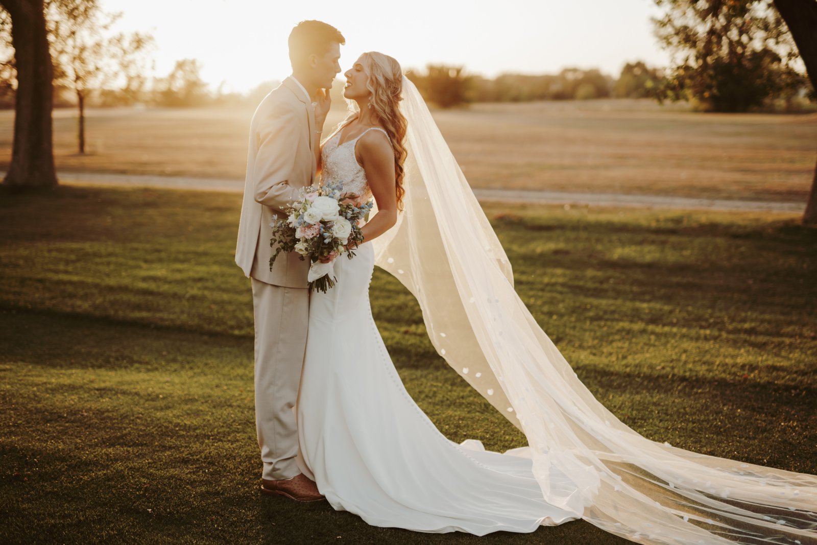 Wedding couple about to kiss on a golf course