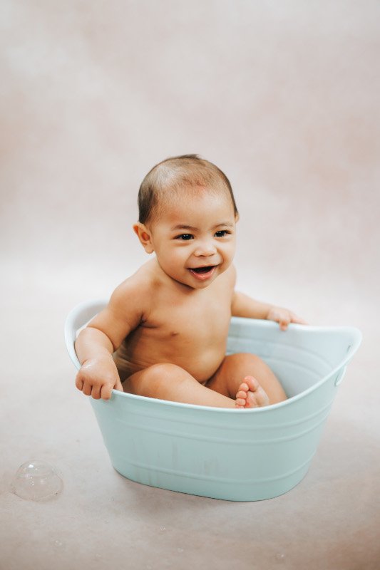 Baby smiling in bath studio portrait