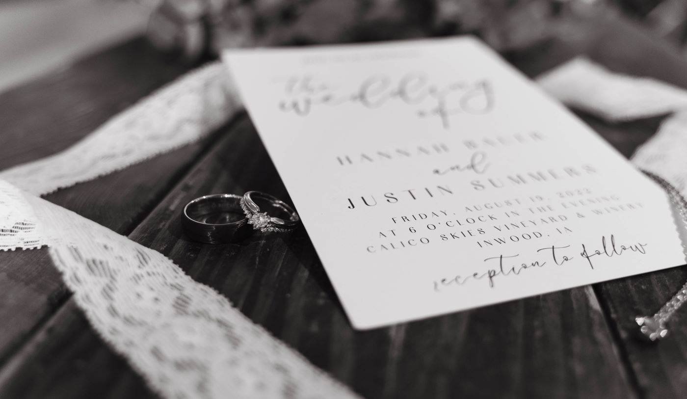 Wedding detail photo of invitation and rings with wood background
